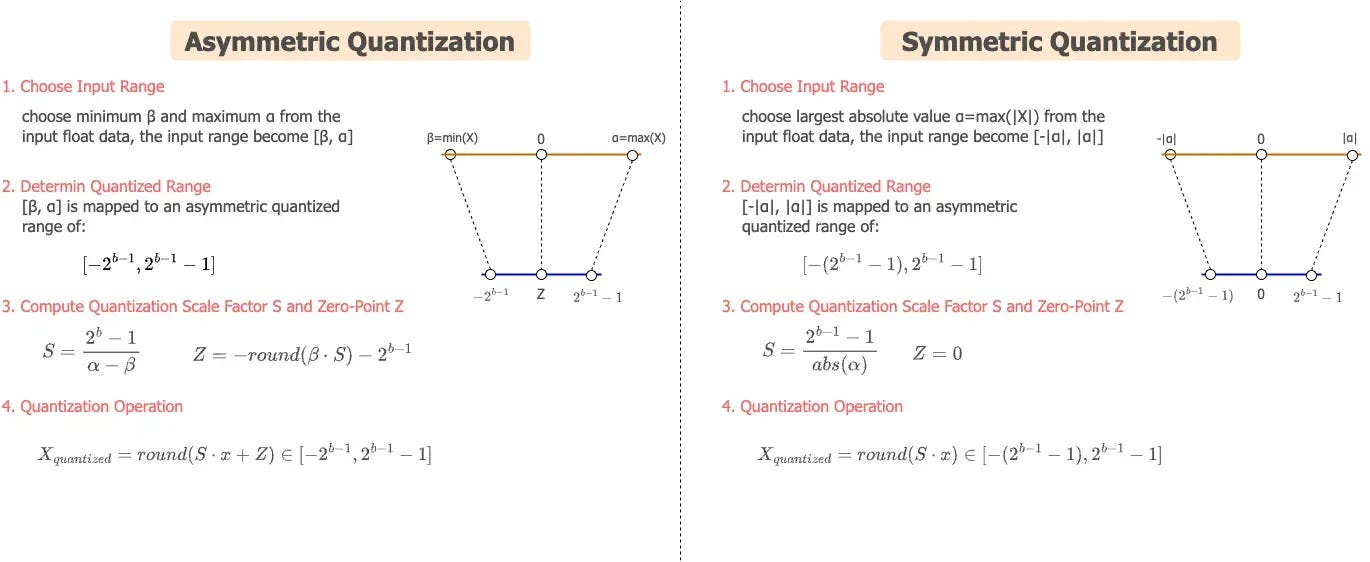 Asymmetric quantization maps [β, α] to [−128, 127] using both a scale factor and a zero-point. Better for layers with skewed weight distributions.