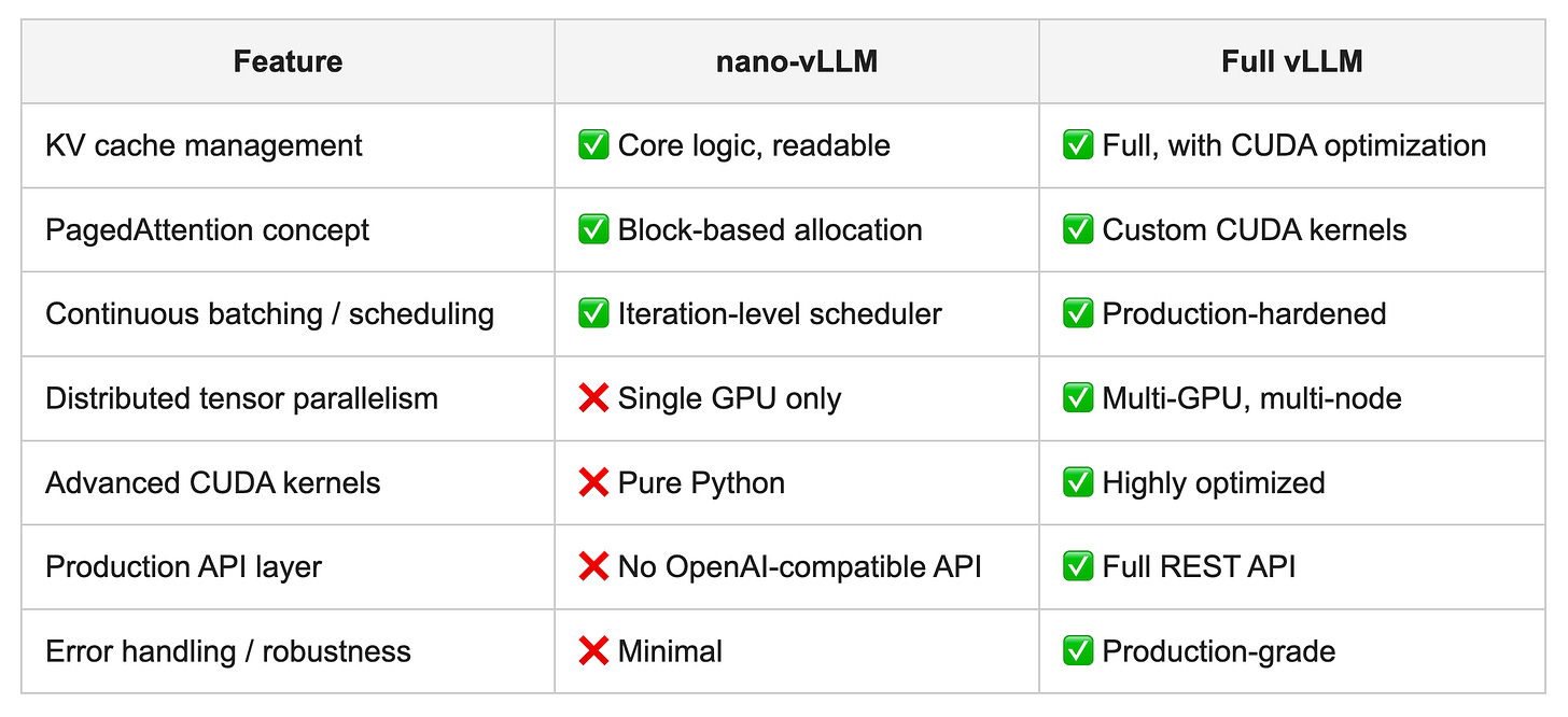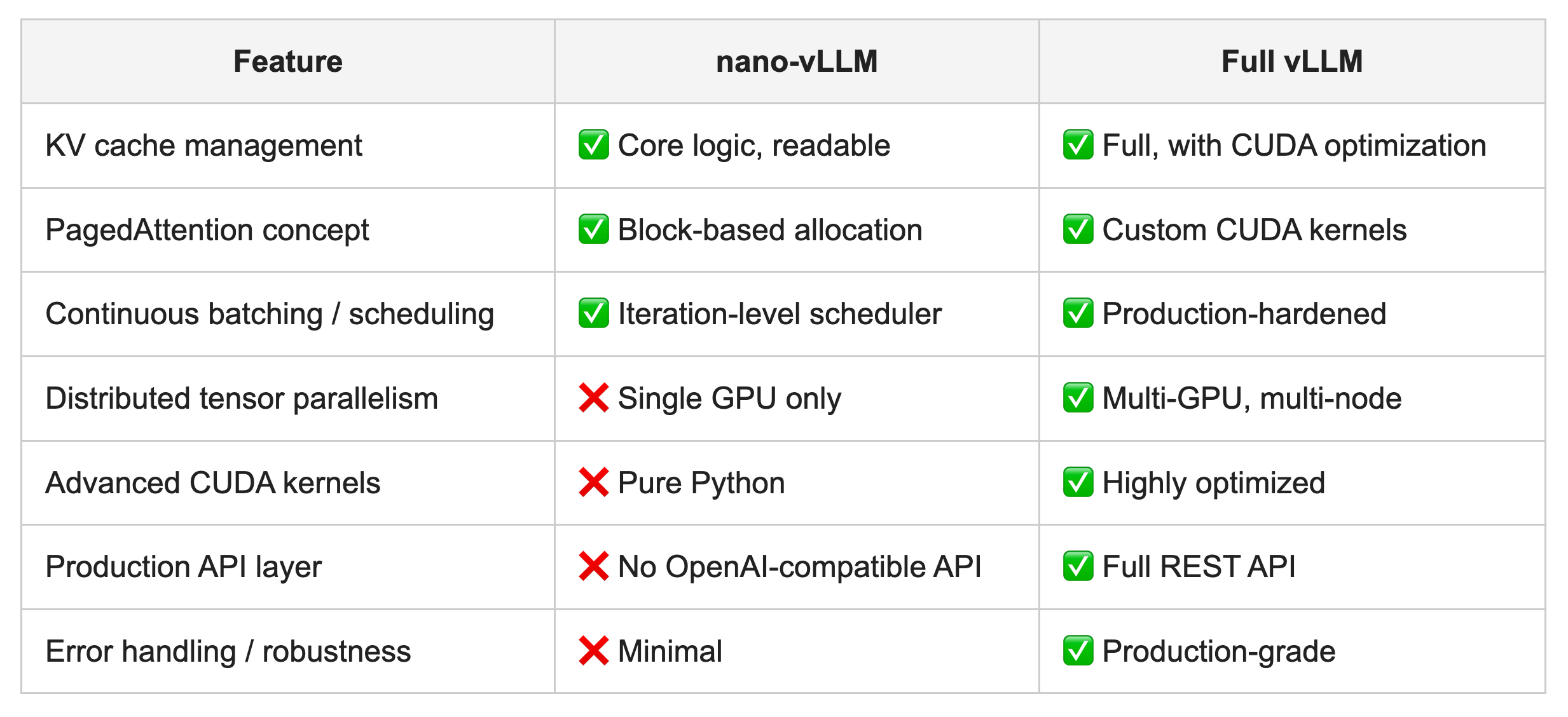 Here’s a clear breakdown of what nano-vLLM implements versus what it intentionally leaves out: