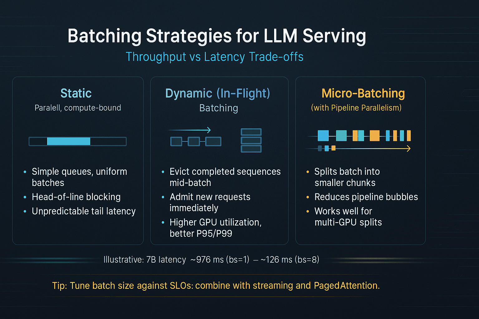 Say your batch has one request generating 2,000 tokens and five requests generating 50 tokens each. Those five short requests have to wait idle while the long request finishes. The GPU is technically busy, but you’re paying a steep latency penalty for every short request in that batch. This is the classic throughput-versus-latency tradeoff that makes static batching a poor fit for real-world LLM serving — and it sets up perfectly why continuous batching was such a meaningful innovation.